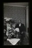"Oskar Henriksson" En man sitter vid ett bord fullt av gratulations-blommor i krukor och vaser.