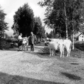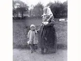 "Med mormor till kyrkan år 1890" E5804_1: Gammal kvinna står utomhus med ett litet barn vid ena handen och en tjock bok i den andra, troligen en bibel då de på bild nr 2 sitter i Tjärby kyrka. E5804_2: Gammal kvinna och litet barn sitter på en utsirad bänk i Tjärby kyrkas kor. Man ser lite av altartavlan och altarringen.