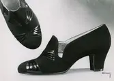 "Mellansko. Eftermiddagssko av svart mocca med skinngarnering, röd resår".