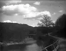 Byggande av bro. Nedströmsvy. Balkarna närmar sig stöd 4. Gamla bron i bakgrunden. Vd von Malmborg och kontrollant Bergström på norra stranden. Riksväg 69.