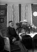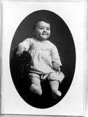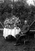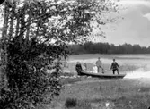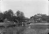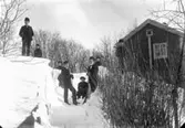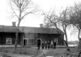 Barn och lärare (präst ?). Byggnad i bakgrunden.