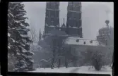 Ett hästekipage har stannat till vid domkyrkan Växjö, en kall vinterdag. Färgfoto ca 1959.