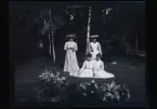 Kafferep. Tre kvinnor sitter i trädgårdsmöblerna vid familjen Morthensens villa Solveden, Djursholm.
