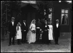 FAMILJEN SAMLAD I TRÄDGÅRDEN INVID BOSTADSHUSET.