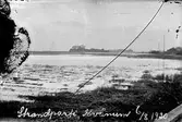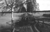 Den översvämmade vägen mellan Sågbron och Nötbron, Fjällvägen vid Fredskogen, där man anordnat särskild gångbana för gående. I vattnet står Erik Jonsson, Hjärtum 1919-07-26.