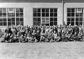 Enligt tidigare noteringar: "Gruppfoto av arbetare utanför verkstadsbyggnad vid Bohusläns regemente."