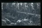 En man står på händer framför en hög med timmer, en annan man står beredd att fånga honom. "Fogelstad såg."