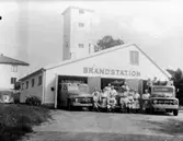Gruppbild på brandmanskapet med brandbil utanför brandstationen.