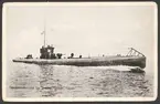 Bilden visar ubåten Ulven till havs. Båten gör låg fart och på däck har samlats två grupper besättningsmän.