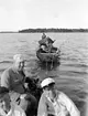 Svartå Herrgård 28 juli 1966 I en sjö utanför Svartå Herrgård sitter två herrar klädda i kostymer, skjortor och slipsar. Den ene ror och den andre fiskar med ett spö i sina händer. Herrgården syns i bakgrunden.