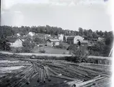 "1931. 61. Baksidan på Folkets hus i närheten af Kanalen." Namn på de boende i husen fr.v.: "1. Hjalmar Flodstrand. 2. Enok Tjäder. 3. Skiftmästare Svensson. (4.--) 5. ElnaTjäder, Viktor Tjäder? 6. Otto Tjäder. 7. Maria Sahlberg. 8. Johan Svärd. 9. Önnebacka gård, Ragnar Johansson. 10.--- 11. Lindeblads. 12. Folkets hus. 13. Fredrik Trogen. 14.---.