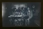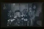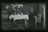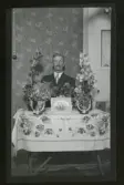 "Karl Fredriksson, Kvarntorp Fogelstad." Porträtt av en man som står vid ett bord fullt av gratulations-blommor.