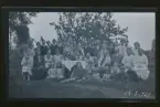"Gluggen, Floda, Axels moster 80 år." Grupporträtt. Kvinnor, män och barn poserar i en trädgård. Axel Fredriksson längst till vänster.