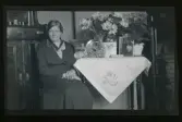 "Gerda Fredriksson, Fogelstads tegelbruk." Porträtt av en kvinna som sitter vid ett bord fullt av gratulations-blommor.