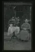 "Albertina Pettersson, Nilslund" Porträtt av en kvinna som sitter vid en syrénbuske utomhus. Där står ett bord med gratulations-blommor.