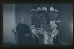 "Valfrid Larsson, kusk på Fogelstad." Porträtt av en man som står vid ett bord fullt av gratulations-blommor.