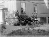 Enligt noteringar: "Två okända män i hästkärra, utanför Färdigs första ateljé på Kvistrum." (BJ)
