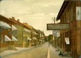 Affärsbebyggelse med markiser. Fasad mot Storgatan - Larmgatan, Kvarnholmen väster om Västra Sjögatan. Bilderna är tagna inom ramen för Kalmar kommuns inventering av Kvarnholmens bebyggelse 1970-1971 och skänkta till länsmuseet.
