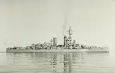 Fartygsporträtt av Pansarskeppet ODEN efter ombyggnad 1915 på Karlskrona redd. De två skorstenarna har ersatts av en.