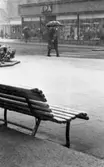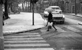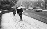 Vårregn, 31 januari 1966 Två damer klädda i mörka kappor, knytskor och handväskor hängamde på armarna samt med paraplyer i händerna är i färd med att gå över en gata i centrala Örebro. Det regnar och ligger även snö på marken. I bakgrunden på trottoaren kommer en man och en kvinna gående. En bil kör på gatan. Byggnader syns i bakgrunden längre bort.