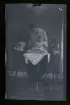 Kabinettsfotografi av en liten flicka i klänning med förkläde, hon står vid ett runt pelarbord.