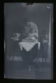 Porträtt av en äldre kvinna med huckle som sitter vid ett pelarbord.