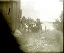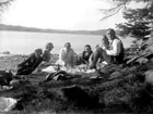 Carl Richard Nyberg, kallad Flyg-Nyberg (längst till höger), tillsammans med flera personer på en pick-nick. Bilden lämnad till Tekniska Museet av fru Greta Broberg, Stockholm, genom filmhistoriska samlingarna jan. 1952