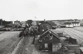 Flygfoto över stationen. Stationen anlades 1862 Gamla stationshuset i trä efter Katrineholmsmodellen har flyttats några hundra meter och blivit bostadshus. 1886 ett andra stationshus, tvåvånings i sten.Arkitekt: Edelsvärd. K-märkt 1986. Stationen omb. 1928. Stationen kallades under byggnadstiden ”Sannaskogen”
