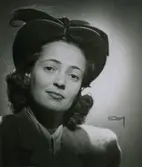 Porträtt av kvinna med hatt i brun velour av Suzanne Talbot. Hatt använd vid franska avdelningens uppvisning september 1947.