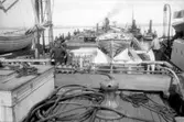 Enl. tidigare noteringar: "Svendborg 1935. Lossning av trälast från fraktskonare. Till v. Anders Karlsson, Paul Myrén och Nils Johansson. Repro 1985 av foto tillhörande Nils Olof Carlsson, Bohus Malmön".