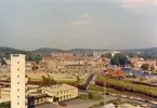 Mölndals brandstation i Trädgården, Mölndal, på 1980-talet. En samling brandmän och ambulansförare står uppställda vid sina fordon.
