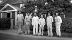 Grupporträtt framför flerbostadshus under byggnation, Uppsala juni 1938