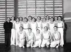 En grupp kvinnliga gymnaster i blus och s.k. ballongbyxor, har gymnastik i gymnastiksalen på dåv. Seminariet.