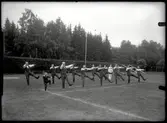 En grupp kvinnliga elever på folkskollärarseminariet (Ringsbergsskolan) i Växjö har gymnastik bakom skolan. Ca 1914. I bakgrunden skymtar skolans vaktmästarbostad.