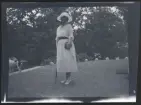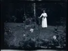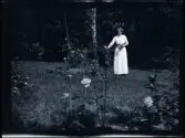 En kvinna sitter i trädgården till familjen Morthensens villa Solveden, Djursholm.