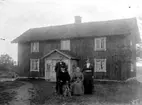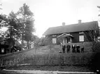 EN FAMILJ MED SINA HUNDAR, SITTANDE I GRÄSET FRAMFÖR HUSET