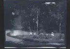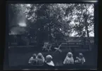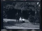 Vy över tomten till familjen Morthensens villa Solveden, Djursholm. En ung man och kvinna ligger på en filt i gräset.
