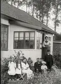 Grevinnan Ebba Mörner med sällskap vid sitt gods Thorönsborg i Sankt Anna. Från vänster ser vi greve Philip Bonde, följd av Emma Witt. På trappan står från vänster först en oidentifierad kvinna åtföljd av Philip Bondes hustru Anna Bonde, född Mörner. Därefter följer enligt uppgift Margareta Cederchiöld, nämnda Ebba Mörner och till sist en okänd kvinna, möjligtvis Augusta Lagerfelt.