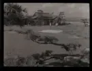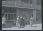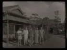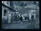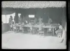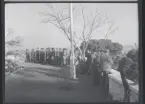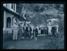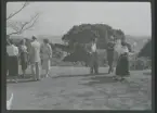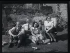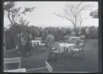 Ett sällskap sitter ute och fikar i en trädgård.