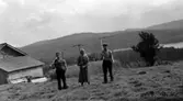 Växtfärgningskursens deltagare i Lekvattnet har draperat sig i sina färgalster.