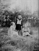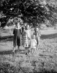Ett äldre par (föräldrarna) poserar med sin son framför sitt bostadshus. I rabatten vid kvinnans fötter skymtar en s.k. skrattkula av glas.
