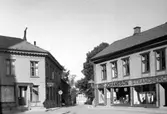 Storgatan. AB Skodon till vänster, Nya Bosättningsaffären till höger. Fotot taget innan Sparbanken byggdes 1928.