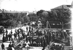 Jordbruksarbete vid Stävlö gård. Män vid en våg i förgrunden och några bönder och oxvagnar därbakom.