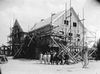 Vara socken. Vara kyrka under byggnad, invigd 1902. Mannen i vitt skägg är apotekare Fritjof Lilja, en av tillskyndarna för att Vara köping skulle få egen kyrka.