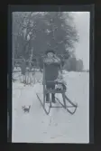 "Frida med dottern Anna-Lisa" Frida Fredriksson skjutsar Anna-Lisa på en sparkstötting. Flickan håller i en docka och i snön intill dem står en leksakskatt.
