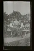 "Ivan, Frida, Axel" Fotograf Axel Fredriksson (t.h.) och hans bror Ivan sitter på en trädgårdsoffa snickrad av björk. Bakom dem står Axels fru Frida.