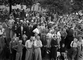 Folksamling på Järnbron, sannolikt i samband med simtävling i Fyrisån, Uppsala 1940