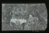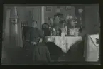 "Anna Johansson (Axels kusin), Abbotnäs." Porträtt av en kvinna som sitter vid ett bord med gratulations-blommor.