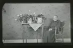 "Oskar Andersson, förkörare, Fogelstad född 1880" Porträtt av en man som sitter vid ett bord med gratulations-blommor.