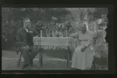"Svenstorp, Berg." Porträtt av en äldre man och kvinna som sitter vid ett bord med gratulations-blommor.
